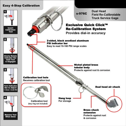Milton Dual Head Field Recalibratable Truck Service Gauge. Quickly and simply recalibrate service gauge with just a click. Manufactured with a premium anodized aluminum stick lasered for readability and accuracy. Pressure Gauge can be use on all kinds of automotive, Industrial and Farm & Agriculture vehicles tire valves (Schrader valve). Adequately checks tire pressure to save on fuel, time and money.