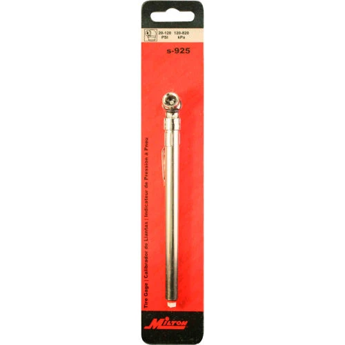 Let Milton pencil tire gauge help you ensure that your tires are always properly and accurately inflated with a trouble free performance for 20-120 PSI. Durable plated brass, single head chuck with 4 side nylon indicator bar. This pressure gauge is a must have for all home garages and shops.