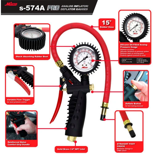 - Analog Inflator Gauge with Rugged Comfort-Grip Handle