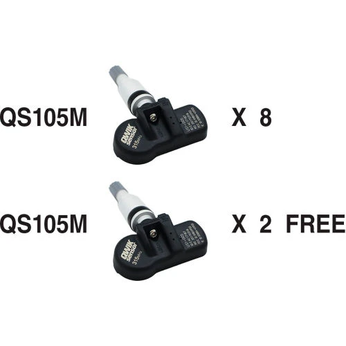 Contains new QWIK-SENSOR Universal Programmable TPMS Sensors with metal valve stems to provide coverage for both domestic and import applications with 314.9/315 MHz TPMS systems. Surface-mounted antenna ensures signal integrity and extended battery life. Undergoes extensive durability testing, including operational temperature, thermal shock, extreme temperature, humidity, frost, proof pressure, rapid deflation, contamination, salt fog, drop, centrifugal force vehicle speed, and mechanical vibration tests. Military-grade lithium battery ensures maximum battery life and sensor performance. Comes fully assembled from the factory ready to install when activated with no valve changes required. Can be OE-relearned or ID-cloned using any major TPMS tool after programming and before installation.