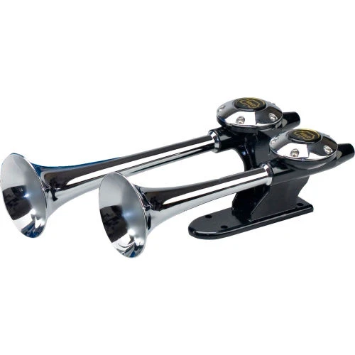 When conditions demand a powerful sound, use the Model 805 roof mounted horn. Every component of the horn is made to withstand the extremes in weather conditions. The mounting base of the Model 805 fastens with four stainless steel bolts which provide a secure watertight installation. The air feeder hose connection has been designed to mount easily and to be hidden from view. Both trumpets are finished in bright chromium triple plated, making the Challenger™ an attractive addition to any truck. Built with quality components that will give years of dependable service. All needed mounting hardware is included. The Model 805 requires an on board air system.
