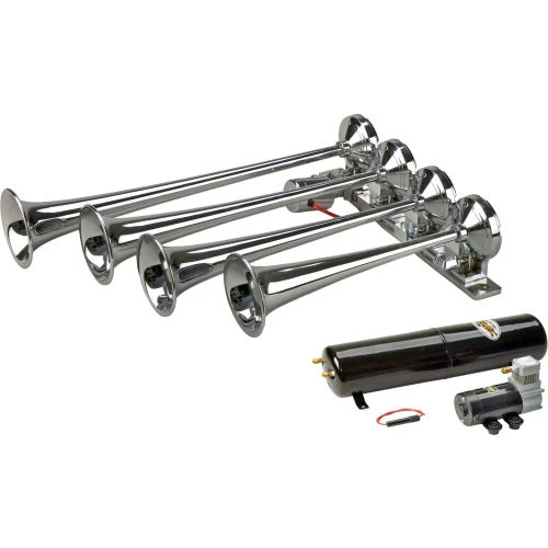 Orient Express Plus has been designed smaller in size for the vehicle owner that wants a powerful train horn sound. Made to fit into an engine compartment that has less available space. The four trumpets are brass triple chrome plated to have a bright finish. Built into the base of the trumpet is a 12 volt electric solenoid valve which is chrome plated. Comes complete with a high-pressure on-board tank system consisting of a heavy duty compressor and a 5.5 liter extended air storage tank. The Orient Express Plus will provide any driver the comfort of knowing that they will be heard!